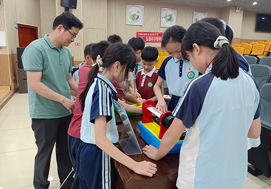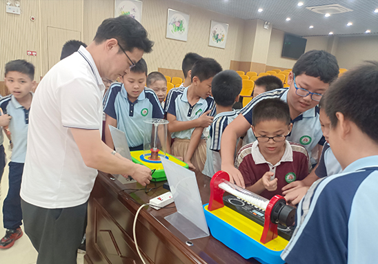 在科學(xué)小動(dòng)手環(huán)節(jié),工程師先演示測(cè)試,隨后學(xué)生們分組動(dòng)手實(shí)踐,進(jìn)行科學(xué)小實(shí)驗(yàn)。