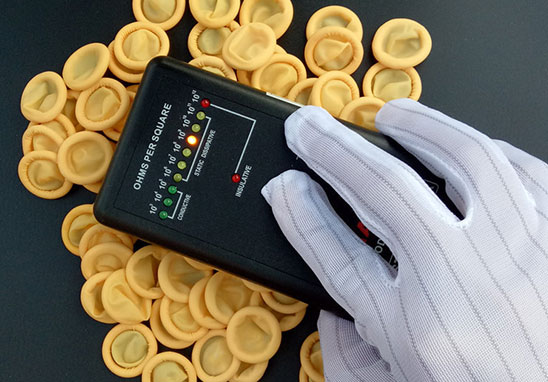 1. SJ/T 10694、GJB3007規(guī)定:指套、手套的內(nèi)表面和外表面兩點間電阻值應(yīng)在1×10^5~1×10^9Ω 范圍內(nèi)。